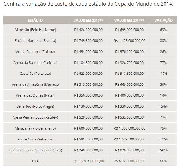 – os estádios brasileiros custaram mais 66% do que o previsto em 2010 (ver tabela anterior).